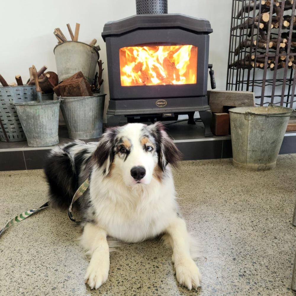 On the chilliest of wintry days, nothing beats walking into a cellar door with your pup by your side and feeling the warmth from a wood-burning stove.  It’s so welcoming and draws you in, inviting you to stretch your hands out (or paws) and warm them.  Have you noticed how dogs always lie as close to the fire as possible?  Henry our rescue koolie overheats merrily, lying right by the fire, panting profusely he’s so hot.